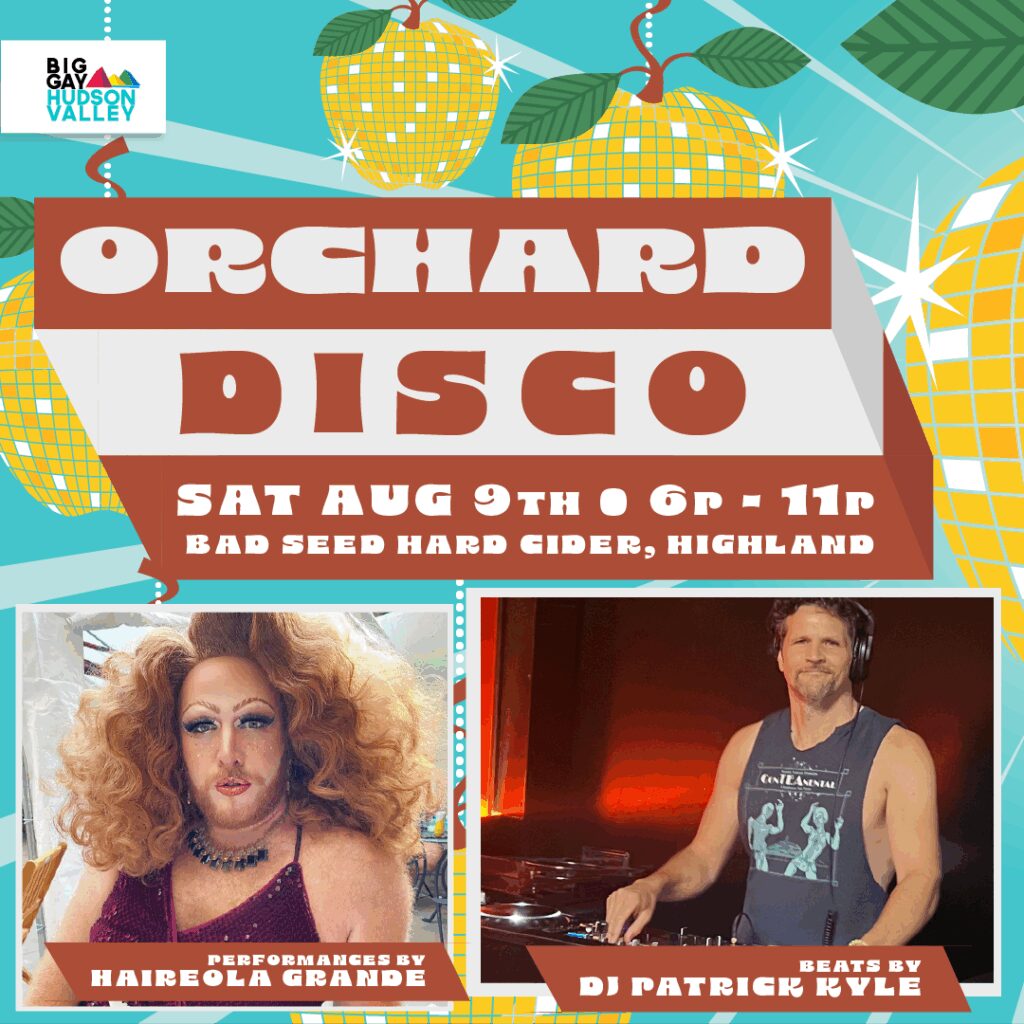 Big Gay Hudson Valley’s hit Orchard Disco party is back for Summer 2025 with three all-new parties at Bad Seed Hard Cider’s Taproom (43 Bailey’s Gap Road, Highland).