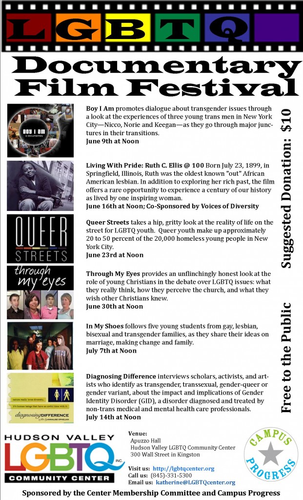 The Hudson Valley LGBTQ Community Center is hosting a Documentary Film Festival in celebration of June’s LGBTQ Pride Month. Six different films will be shown all month long throughout June & July at the Center’s Apuzzo Hall (300 Wall Street, Kingston). The films are open to the public with free admission (with a $10 suggested donation being accepted to benefit the Center). For more information about the festival, visit the Center’s website, give them a call at (845) 331.5300 or check out the listings below.