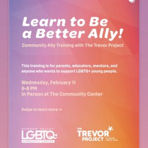 As a safe, supportive environment based in Kingston, NY, the Hudson Valley LGBTQ+ Community Center provides services, programs, events, and professional resources to unite the lesbian, gay, bisexual, transgender, and queer/questioning community across lines of age, race, gender, and economics. Since our founding in 2005, our purpose has been to strengthen, support, and celebrate LGBTQ+ individuals, families, and groups in their efforts to achieve their fullest potential.