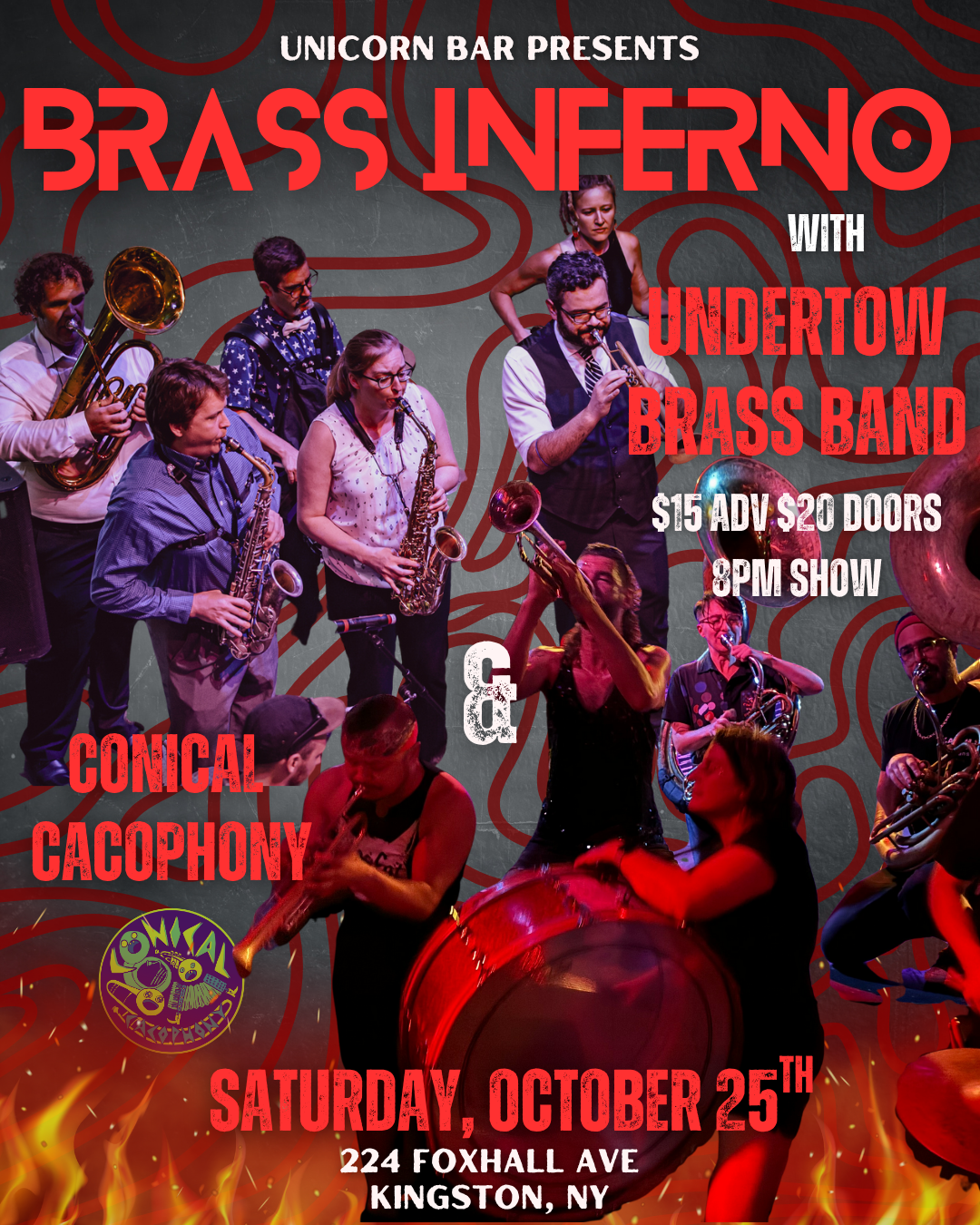 Join us on Saturday, October 25th for BRASS INFERNO with @undertowbrassband & @conicalcacophony. This double bill is so hot we had to give the night a name. Join us for what is sure to be a fiery night of punk brass music, bold Balkan rhythms, and dancing (moshing?) with these two truly incredible brass outfits. Undertow Brass Band, formerly known as What Cheer? Brigade, is an energetic party band from Providence, RI, USA. They are loud, tight, & love to dance with crowds, offering mobile moments of intense revelry. Their music includes covers and originals, taking inspiration from genres ranging from Balkan, New Orleans, & other global brass traditions, as well as electronic dance music, classical, & pop. The band emerged from the Providence underground music scene in 2005, inspired by the unlikely overlap between the intensity of punk rock and brass. From these origins, the band developed its original sound, with one foot in Balkan tradition, the other in the American punk scene. Conical Cacophony is a Boston-based brass band delivering Balkan-inspired dance jams. Dazzling horns! Blazing beats! With heavy influence from the music of Macedonia, Serbia, and Bulgaria, & a penchant to party, these rabble rousers will light up any stage or street. These are some of our favorite brass bands of ALL TIME and you really won’t want to miss this. $15 ADV/$20 Doors 7PM Doors/8PM Show