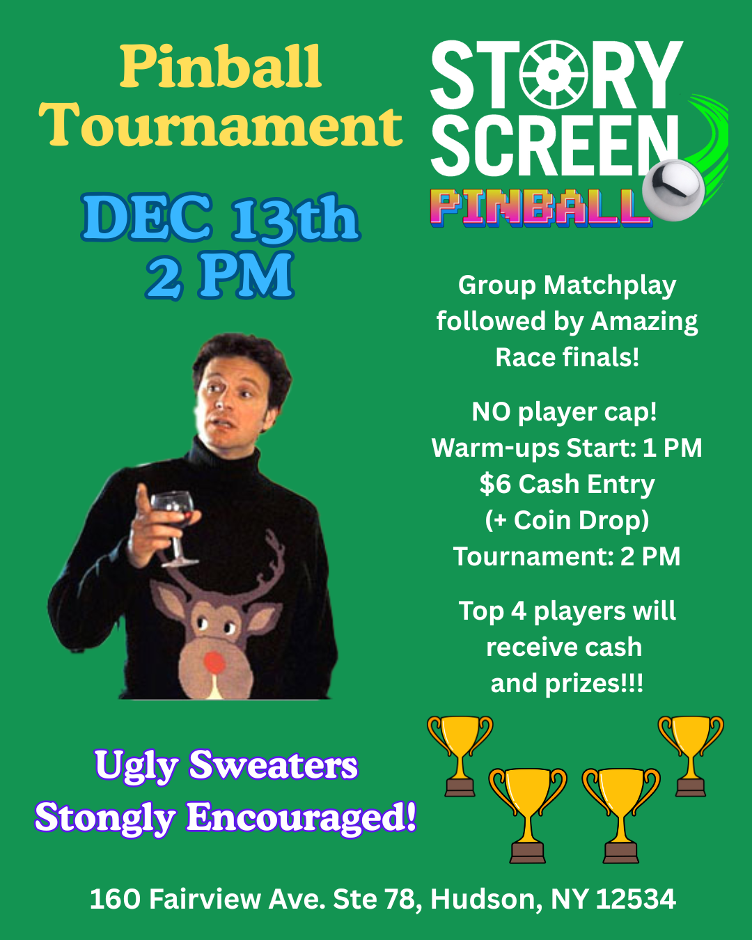 Story Screen Pinball – December 2025 Tournament – Ugly Sweater Edition! Group matchplay followed by Amazing Race finals! For finals, games will be set on FREE PLAY. All tournament games and/or warm-up games may be submitted for WINTER SELFIE LEAGUE as well, just be sure to take a photo for submission. NO player cap! Warm-ups at 1 PM, announcements at 2 PM | $6 cash-only. Top 4 receive cash and prizes! At least 1 random raffle for prizes!