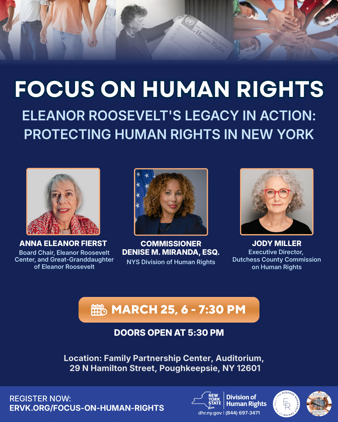 Join us for a free in-person conversation exploring how Eleanor Roosevelt’s leadership in shaping the Universal Declaration of Human Rights continues to influence human rights work today. Hear from Commissioner Denise M. Miranda, Esq. of the New York State Division of Human Rights, Jody Miller, Executive Director of the Dutchess County Commission on Human Rights, and Anna Eleanor Fierst, Board Chair of the Eleanor Roosevelt Center (ERVK), as they discuss the ongoing efforts to protect and advance human rights at both the state and local levels. This engaging dialogue will highlight practical strategies, local initiatives, and the ways Roosevelt’s legacy continues to inspire action today.