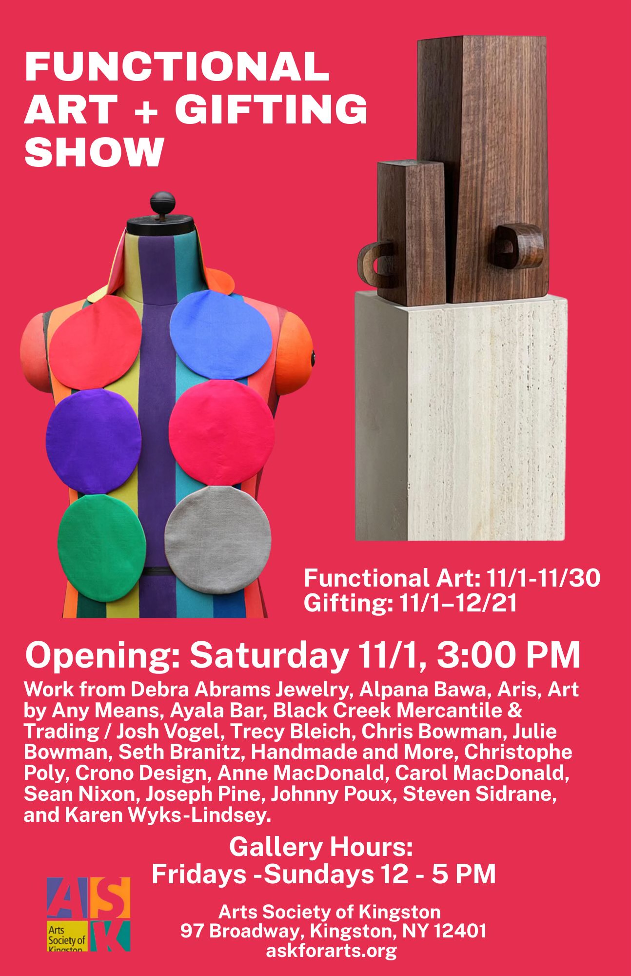 In the Functional Art Show, ASK features an invitational collection of furniture, objects, clothing, and wall art created by artists and designers including Debra Abrams Jewelry, Alpana Bawa, Aris, Art by Any Means, Ayala Bar, Black Creek Mercantile & Trading / Josh Vogel, Trecy Bleich, Chris Bowman, Julie Bowman, Seth Branitz, Handmade and More, Christophe Poly, Crono Design, Anne Mac Donald, Carol Macdonald, Sean Nixon, Joseph Pine, Johnny Poux, Steven Sidrane, and Karen Wyks-Lindsey. Each artist contributes a unique vision of how art can enliven daily living through craftsmanship and imagination. The Functional Art Show will be exhibited in ASK’s Spotlight Gallery from November 1 through November 30. Complementing these exhibitions, in the Front Gallery, The Gifting Show will feature a curated selection of holiday items—including jewelry, small works, cards, scarves, clothing, pillows, and ceramic ornaments—available for purchase from November 1 through December 21, 2025. This inaugural ASK tradition invites visitors to discover locally made, one-of-a-kind works perfect for holiday giving.