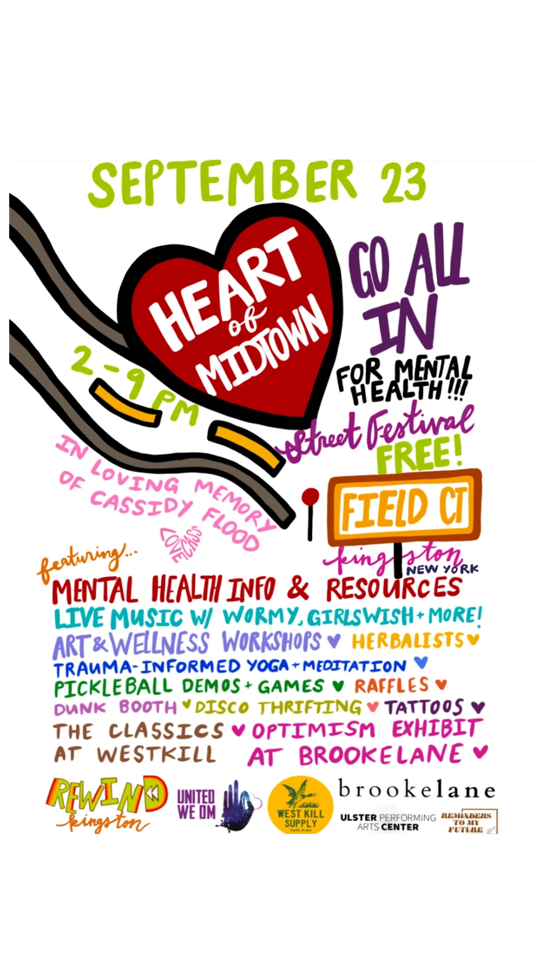 FREE live music, art and wellness workshops, trauma-informed yoga and meditation, pickleball, and more! we invited organizations that provide mental health services in our community to host a table and share information to raise awareness to the mental health crisis that faces our youth and provide information of the services and tools that exist in our community. workshops include zine making, building community free little library, singer songwriter workshops, flash tattoo sale, flower arranging, DIY journal, collaging, art therapy, herbalism and more! hosted by rewind kingston, westkill supply, radio kingston, upac, brookelane, and pakt.