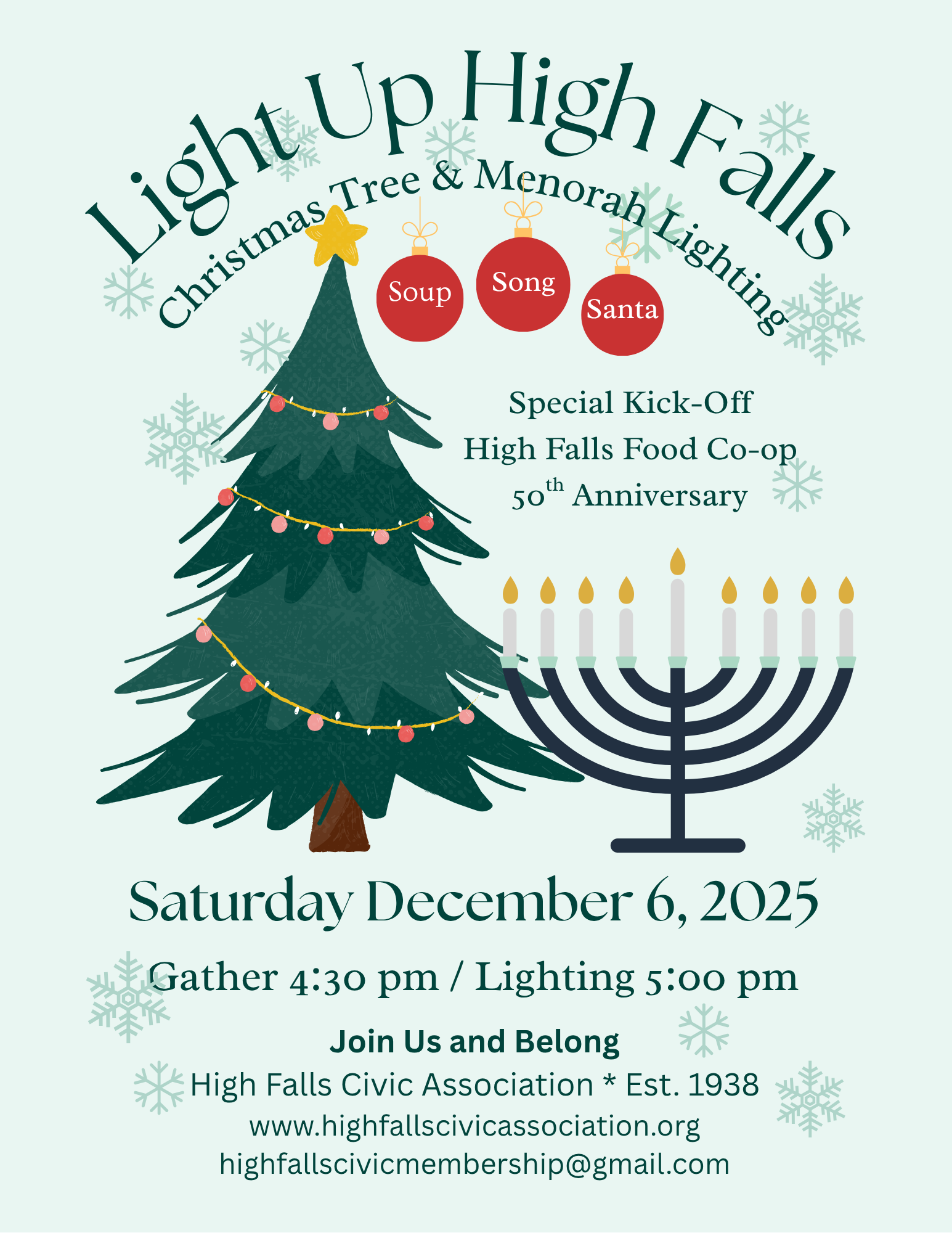 Join the High Falls Civic Association for a magical evening of song, soup, and Santa as they light the magnificent Christmas Tree & Menorah on the Village Green in High Falls. Free. All are welcome and we hope you will join us for some Christmas Cheer!