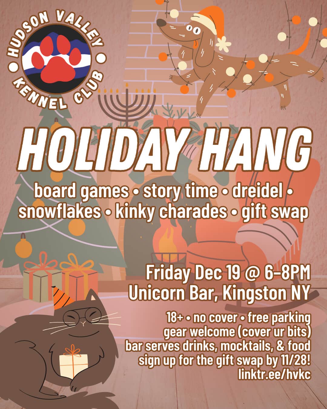 It’s the coziest time of year — get even cozier at HVKC’s Holiday Hang! Members (and new folks) are invited to join us for board games, spicy charades, dreidel with Dio, story time with Mahk, and paper snowflake crafting for the aesthetically inclined.