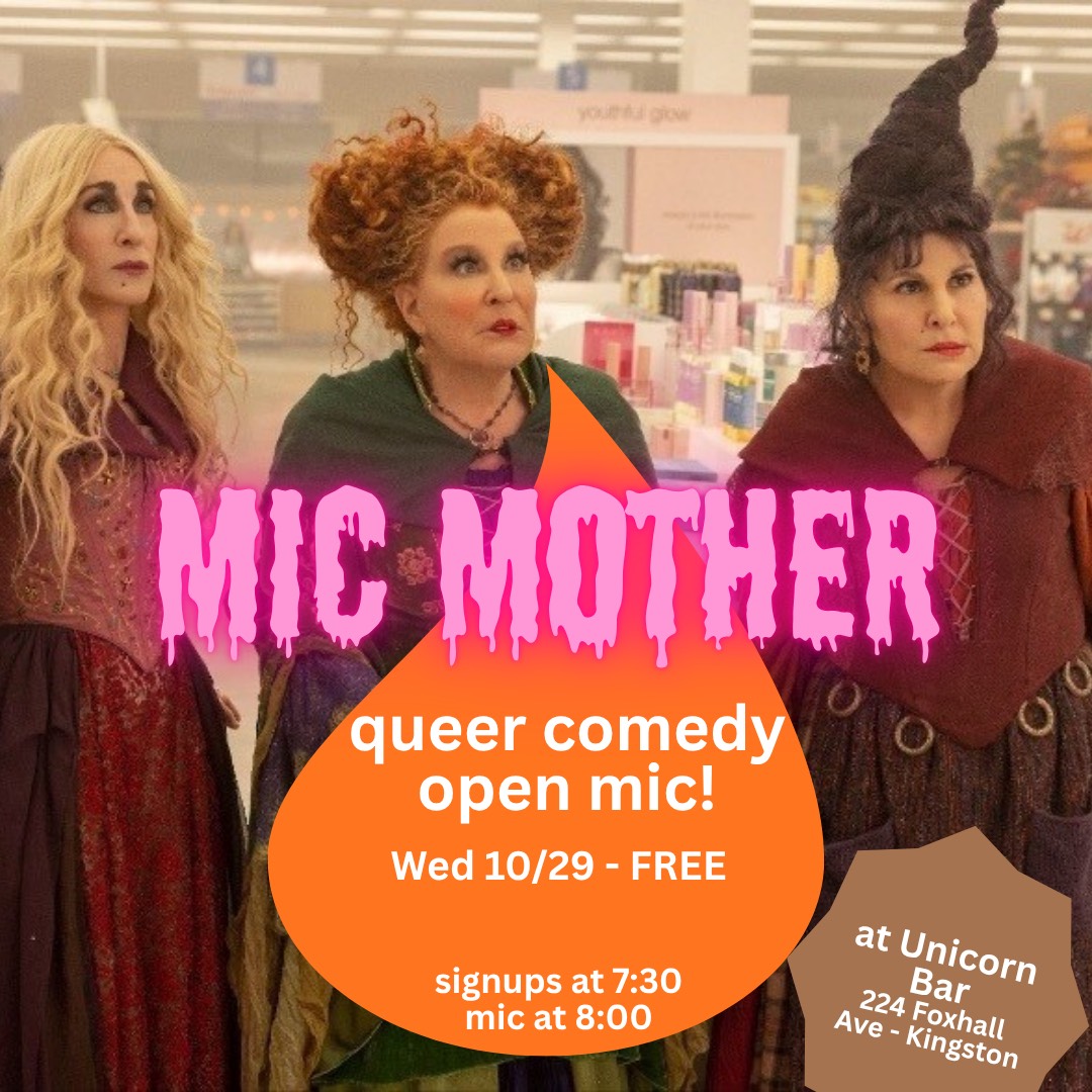 MIC MOTHER, Unicorn Bar’s queer comedy open-mic, is back for another round on Wednesday, October 29th! Co-hosts Andy Monk and Caroline Contillo bring you another opportunity to get on stage and make your community laugh. Sign up for your 7 minutes of stand-up in advance by DMing @micmother on Instagram or emailing micmotherkingston@gmail.com, or sign up in person starting at 7:30PM. If it’s your first time, great! If you came last time, come again!