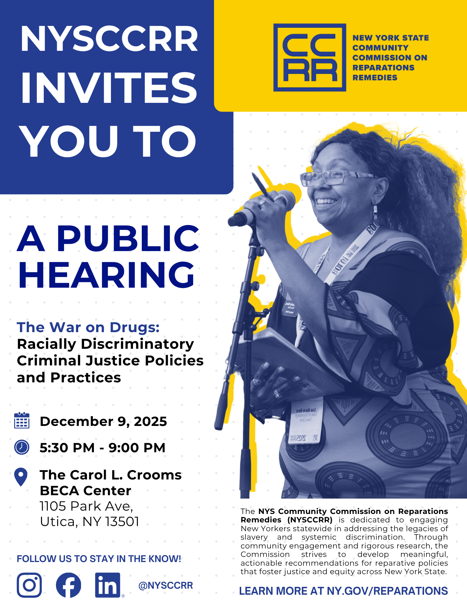 The NYSCCRR is dedicated to engaging New Yorkers statewide in addressing the legacies of slavery and systemic discrimination. Through community engagement and rigorous research, the Commission strives to develop meaningful, actionable recommendations for reparative policies that foster justice and equity across New York State.