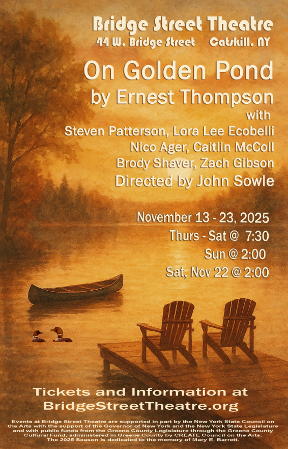 Catskill, NY — As autumn settles over the Hudson Valley, Bridge Street Theatre closes its fearless and bold 2025 season with one of the most beloved plays in modern American theatre: “On Golden Pond” by Ernest Thompson. Performances run November 13 through November 23 on BST’s intimate “Priscilla” Mainstage at 44 West Bridge Street, Catskill. Showtimes are Thursdays, Fridays, and Saturdays at 7:30 pm, Sundays at 2:00 pm, plus a special 2:00 pm matinee on Saturday, November 22.