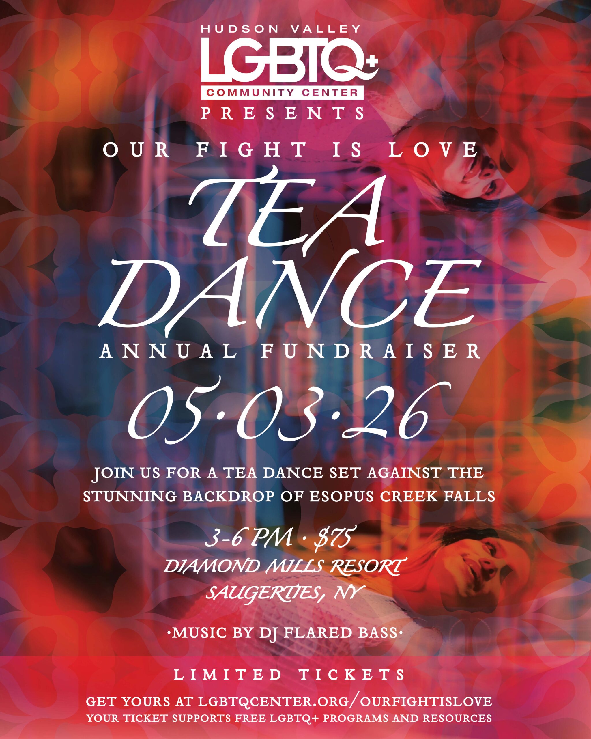 Kick off Pride at the Hudson Valley LGBTQ+ Community Center’s Annual Fundraiser Tea Dance! Join the community for an unforgettable afternoon of dancing, celebration, and love set against the stunning backdrop of Esopus Creek Falls at Diamond Mills Resort in Saugerties, NY.