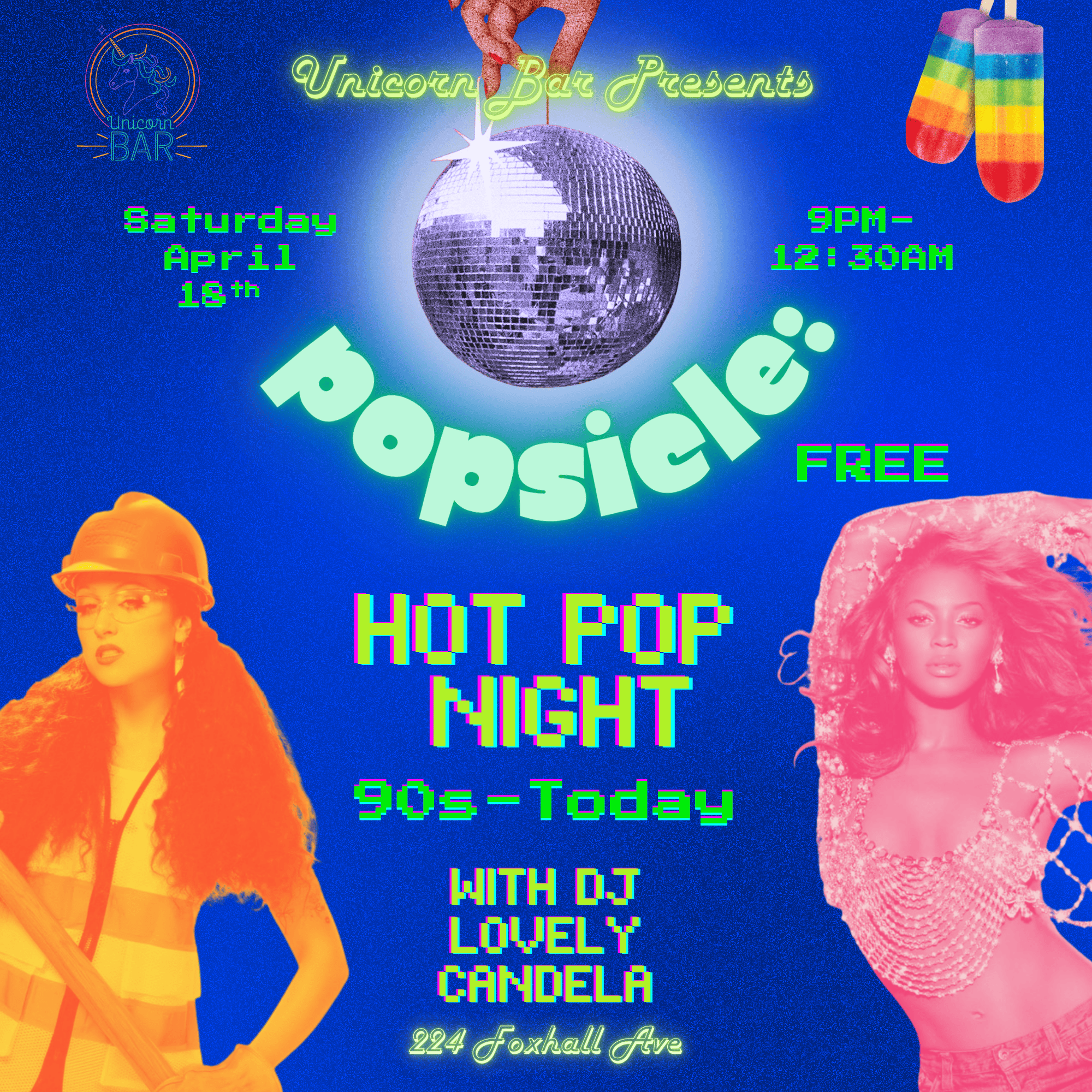 Join us on Saturday, April 18th for POPSICLE: Hot Pop Night! 💖🍬🪩 Enjoy the hottest, classic hits from the 90s til’ today – Britney, Janet, Beyoncé (of course) + Chappell, Charli, Raye, Kehlani and more. ✨
