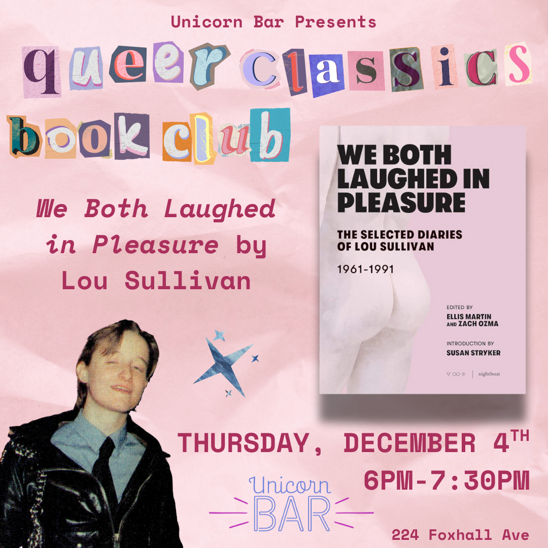 Join us on Thursday, December 4th from 6:00-7:30 PM as we discuss “We Both Laughed In Pleasure: The Selected Diaries of Lou Sullivan,” a book the New Yorker described as “Celebratory, even radical” and Hyperallergic called “Monumental.”