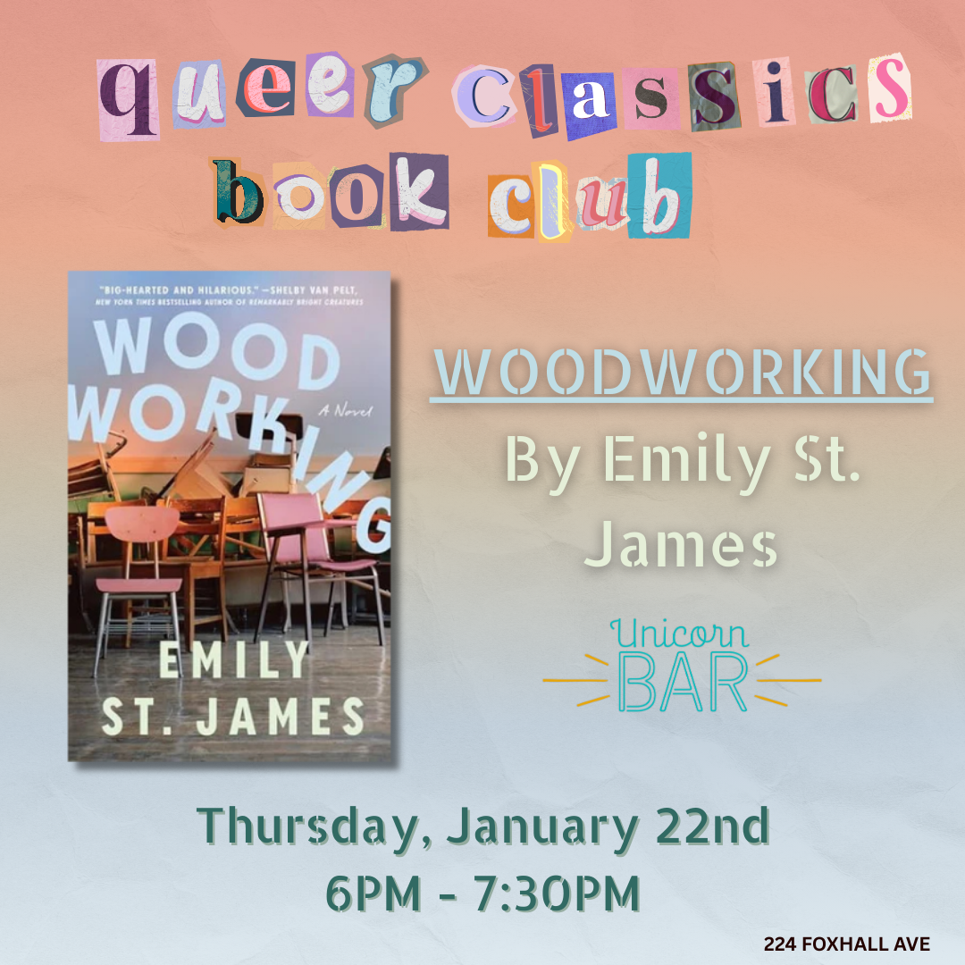 Our next selection for the Queer Classics Book Club is the novel “Woodworking” by Emily St. James, an inter-generational trans dramedy that’s deeply moving, funny, and a real page turner. Join us Thursday, January 22nd from 6:00-7:30 PM for a lively discussion in queer community at Unicorn Bar – whether you’ve read all or some of the book.