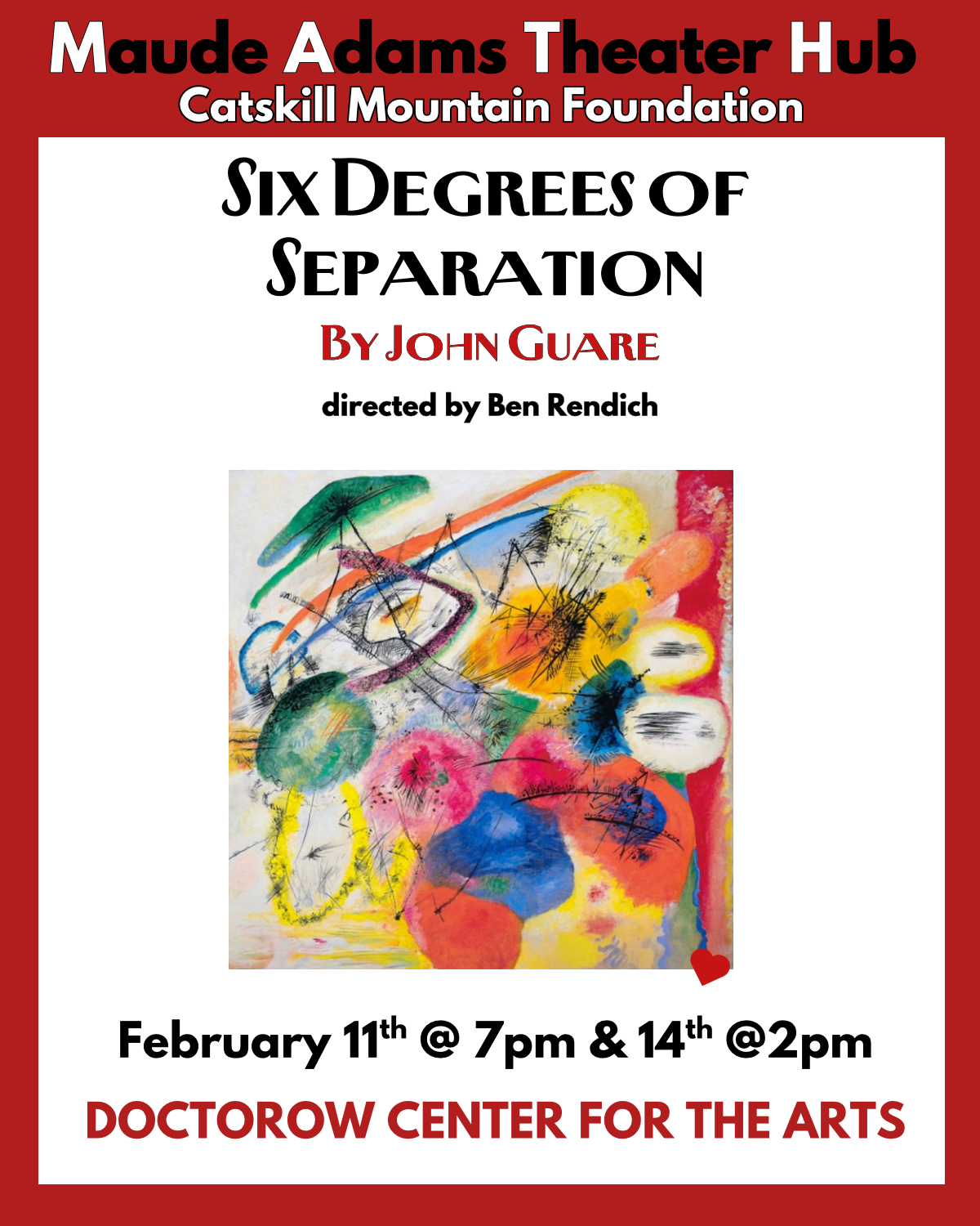 Maude Adams Theater Hub and Catskill Mountain Foundation present a staged reading of John Guare’s SIX DEGREES OF SEPARATION on Wednesday, February 11th at 7pm and Saturday, February 14th at 2pm.