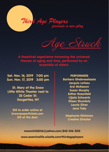 Aging can be challenging, joyful, painful, puzzling, funny, and an opportunity for creative growth. Third Age Players is an ensemble of straight and gay elder women who fearlessly explore and share the universal themes of aging. After our performances we will be happy to talk with the audience. Performers: Barbara Ghebreselassie, Jacquie LeVezu, Arzi McKeown, Susan Murphy, Esther Rosenfeld, Ujjala Schwartz, Eileen Shumbris, Laurie Silver, Jane Toby. Creative Director: Stephanie Glickman.
