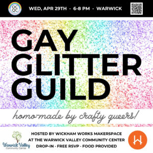 11am: The Party starts at the Warwick Valley Community Center with free brunch, art, music, henna, support tables, fun and community. The Pride Parade led by Funkrust Brass Band, steps-off from WVCC at 1.30pm, to Main Street and arrives at Stanley Deming Park for The Pride Show, 2.30 – 4.30pm, hosted by drag darling, Ms. Eve Starr and a sparkling line up of guest performers. The event is free, family-friendly, and all are welcome.