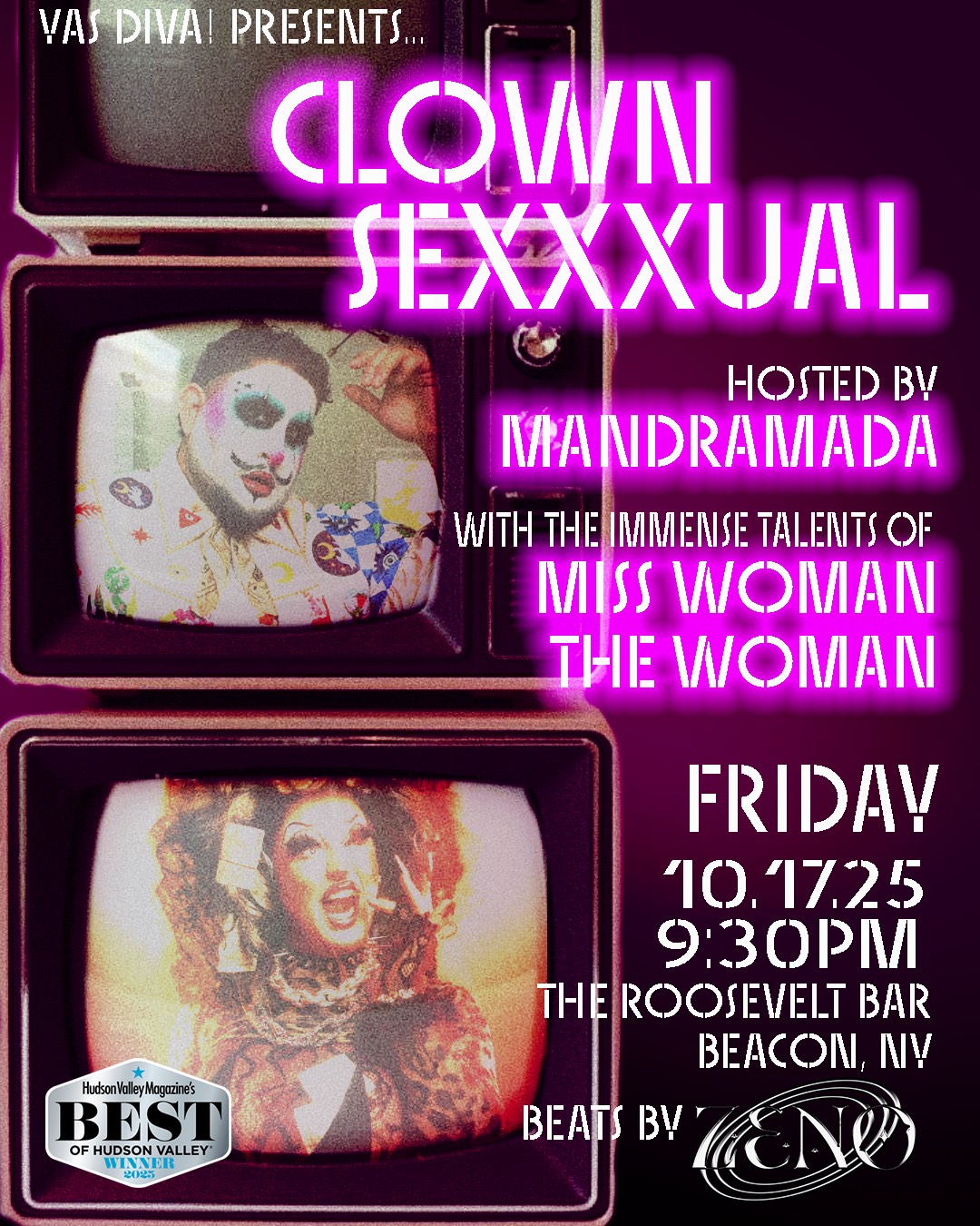 Step right up and paint your face, darling — it’s time for CLOWN SEXXXUAL, a deliriously camp, irresistibly seductive, and hilariously chaotic drag spectacular brought to you by YAS DIVA, the Hudson Valley’s top-rated drag experience!