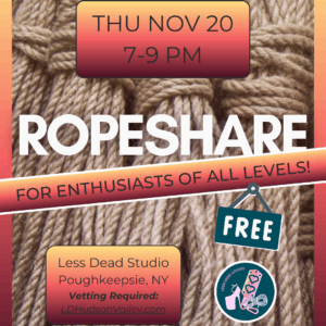 “The Untitled Ropeshare” Community Rope Jam (Nov. ’25) Free rope share, monthly on last Thursdays! (November is 1 week early due to Thanksgiving) 20 Nov 7:00 pm - 9:00 pm Less Dead Studio Poughkeepsie, NY