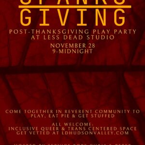 Spanksgiving Post-Thanksgiving Play Party Get stuffed, trussed, or just gorge on pie! 28 Nov 9:00 pm Less Dead Studio Poughkeepsie, NY