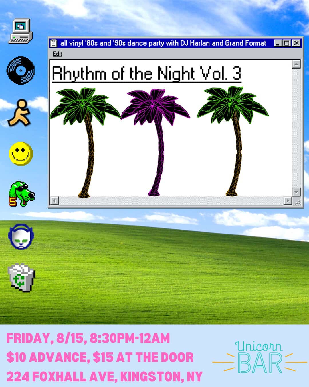 On Friday August 15th, Unicorn Bar hops into the DeLorean and gallops back to a time where the dance floor reigned supreme and all you had to do was follow the “Rhythm of the Night”