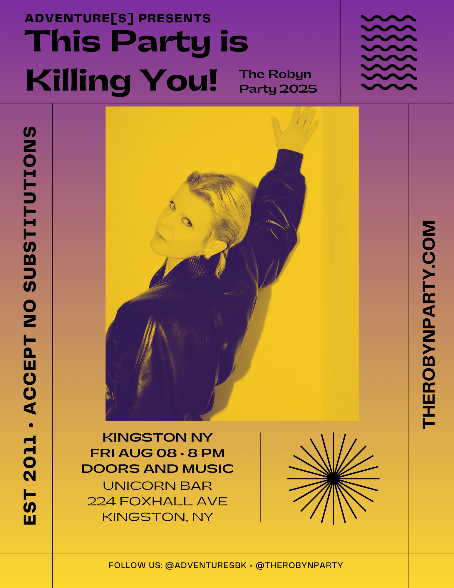 This night is high-key a celebration of the joy and euphoria of pop music, particularly the music of the Swedish goddess of pop, Robyn, in all her flavors and forms, but also a celebration of ADVENTURE[s] This Party Is Killing You!: The Robyn Party’s 14th birthday! It's the best pop nite on the planet.