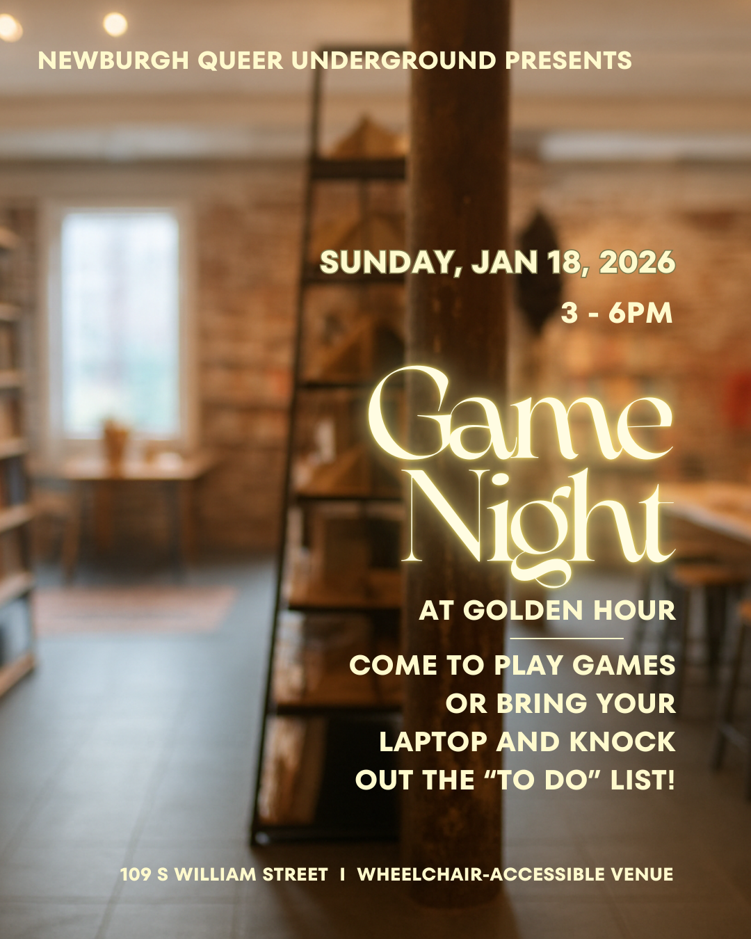 Come hang out at Newburgh’s independent bookstore! There will be board games, but also you could bring your laptop and knock things off your “to do” list.