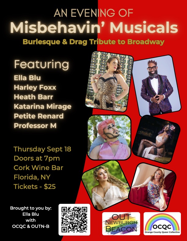 Orange County Queer Collective and OUTNewburgh-Beacon are teaming up this fall to bring you an evening of Broadway Burlesque. Produced by the incomparable Ella Blu, this is an event you won't want to miss! There will be drag, there will be burlesque...there will be laughter (and quite possibly tears) - our performers are that good. For some added fun, show up in your Broadway-inspired look for a chance to win a prize!