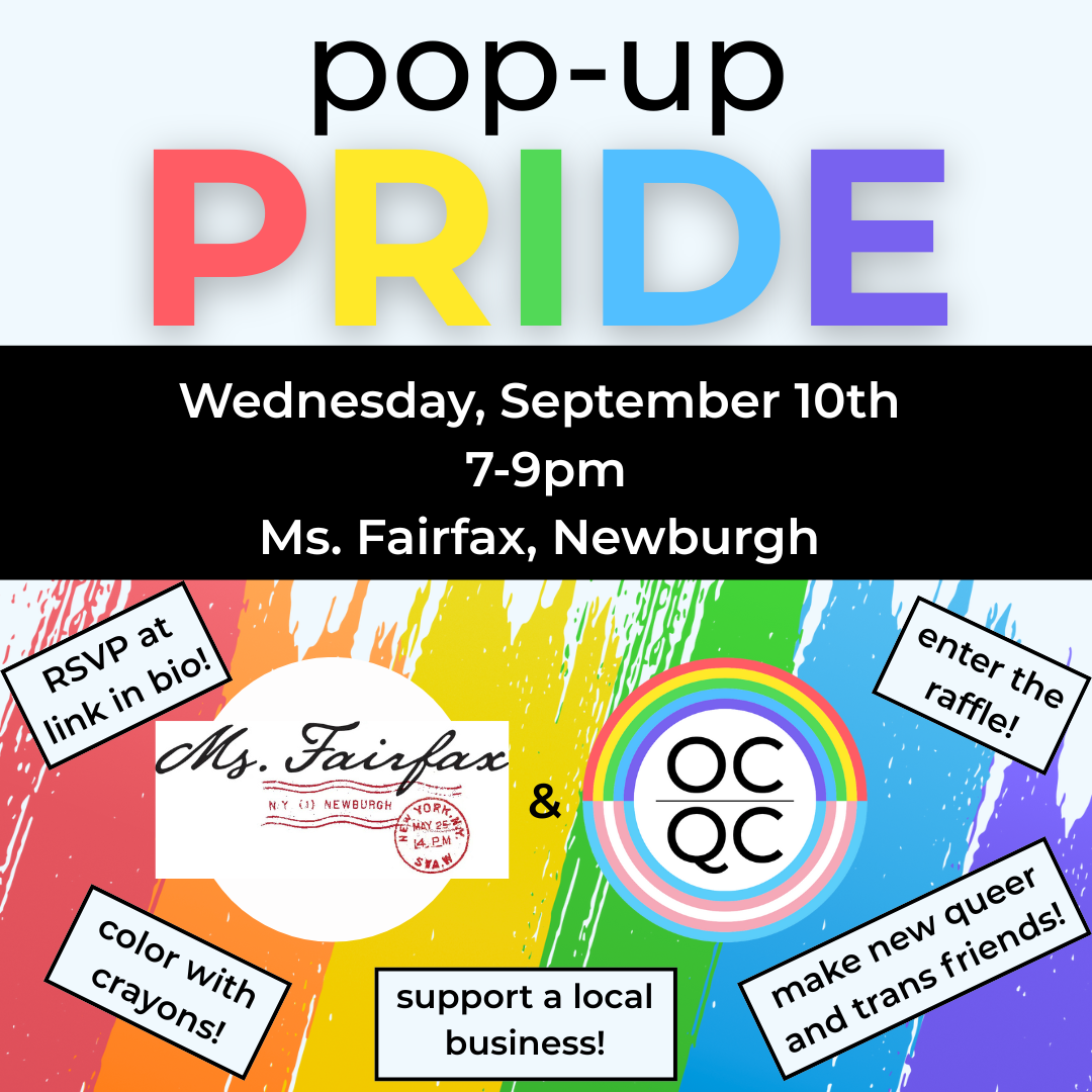 Join Orange County Queer Collective and like-minded folks in your community on Wednesday, September 10th for our monthly Pop-up Pride event at Ms. Fairfax in Newburgh! This is part of a recurring event series where LGBTQ+ residents and allies can gather in community each second Wednesday of the month at a different local business in Orange County. The events are informal meetups with a drop-in window from 7-9pm.