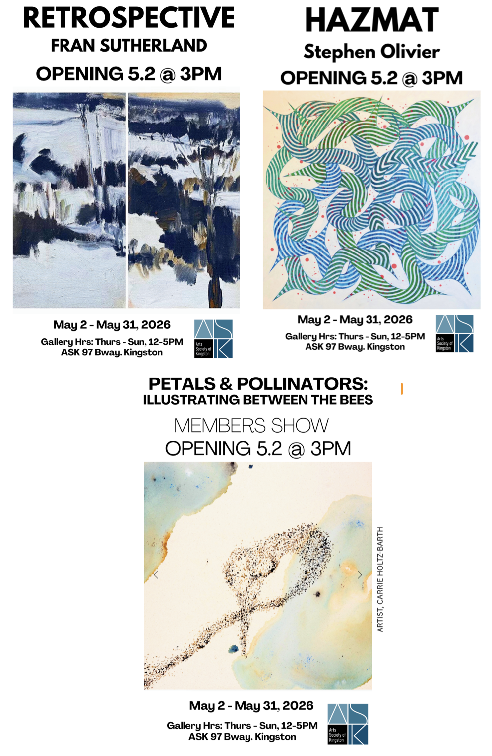 The Arts Society of Kingston (ASK) is pleased to present three new exhibitions opening May 2 and on view through May 31. The exhibitions feature Hazmat, a solo presentation by artist, Stephen Olivier, alongside the Retrospective exhibition by artist Fran Sutherland, and the members exhibition Petals & Pollinators: Illustrating between the bees.